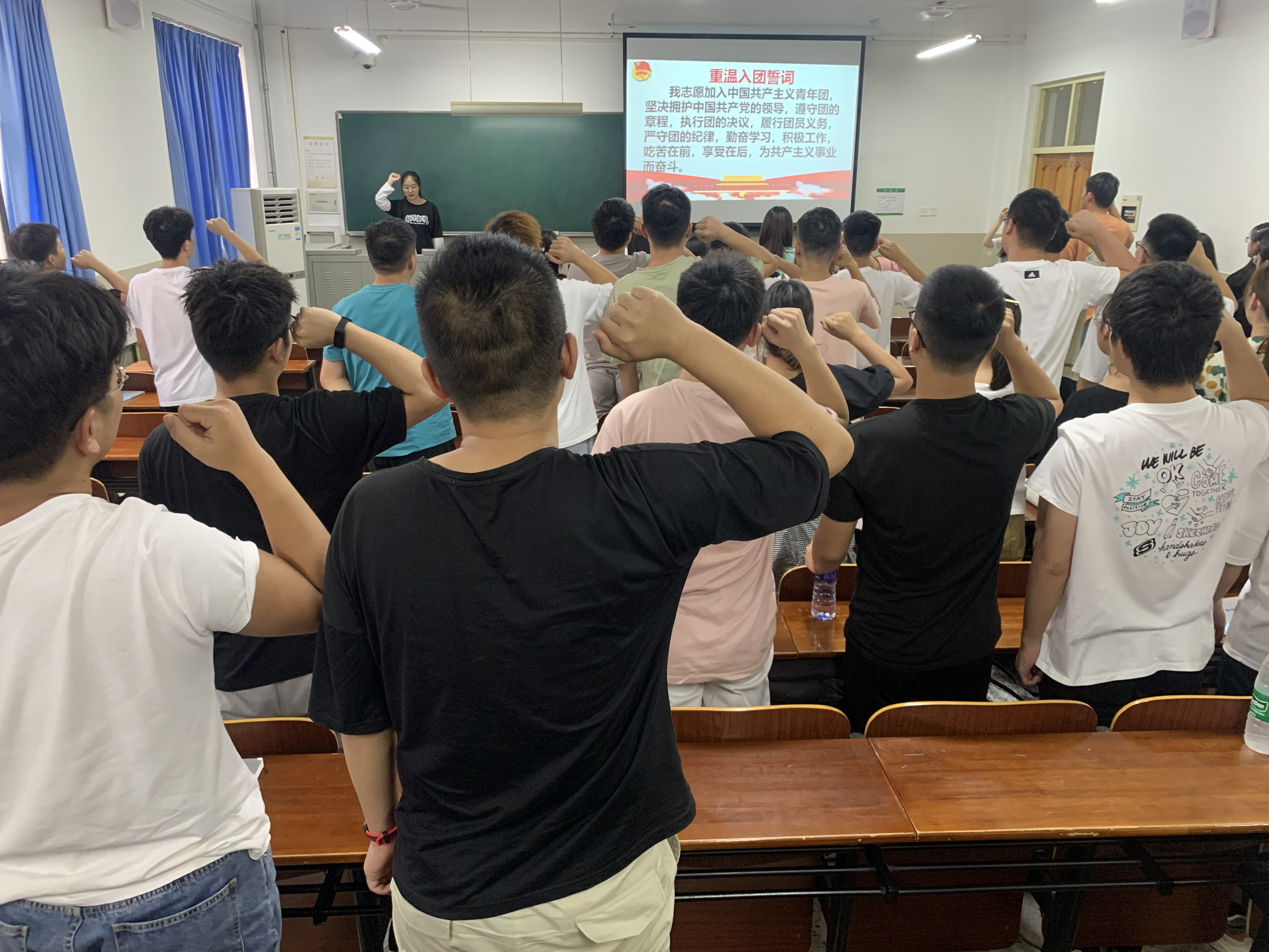 活动伊始,我支部青年团员们高举右拳,重温入团誓词,重新感受初为共青团员庄严宣誓时的光荣和喜悦,简短、庄重、热烈的宣誓仪式,使全体团员再接受一次“沉浸式”的精神洗礼,一次严肃而庄重的教育,坚定理想信念,牢记使命担当。随后,团支书向大家介绍甘孜州巴塘县莫多乡郎翁村驻村干部熊杰,“新时代的青年人只有将有限的青春投入中华民族伟大复兴的新征程中去,才能真正找到人生的意义和价值。”他将三年青春岁月播撒在脱贫攻坚的土地上,“这是我青春中最光彩的画面。百年前新青年们以身许党许国的忠诚,将一直激励我再接再厉、奋斗不息。”习近平总书记指出,新时代的中国青年要增强做中国人的志气、骨气、底气。所谓“志气”就是要胸有大志,眼光长远、视野开阔,勇于做时代的弄潮儿。到了班级同学积极讨论的时候,团支书曹叶叶同学表示:“作为新时代新青年的我们,更应再接再厉、奋斗不息。如此,我们才能掷地有声地发出‘请党放心,强国有我’的呐喊!”至此,本次团日活动圆满结束。