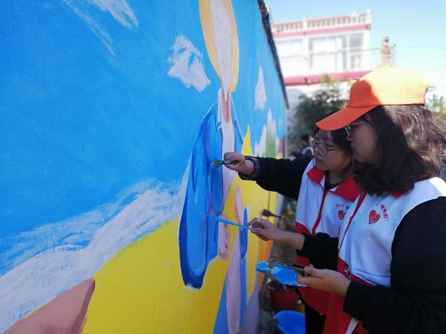 在老师的指导下,下午四时,一幅秋日丰收彩绘图最终完成。画中农民伯伯手捧麦穗,满眼喜悦,放眼望去,田陇上一片金黄。原本单调的空白墙面瞬间被丰收的幸福感充盈。志愿者们用手中的画笔,一笔一画,传递了对建设美好乡村的祝愿,也为建设乡风文明献出了自己的一份力量。