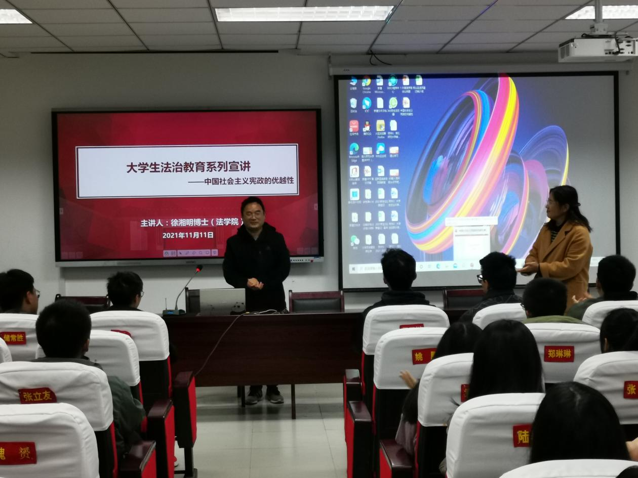 为深入学习贯彻习近平法治思想,推进大学生法治教育,11月11日晚,外国语学院邀请法学院徐湘明博士在综合楼913会议室为2021级新生作《中国社会主义宪政的优越性》专题讲座。讲座由学院党委书记崔凤梅主持,2021级级辅导员王玉川和学生百余人聆听了讲座。