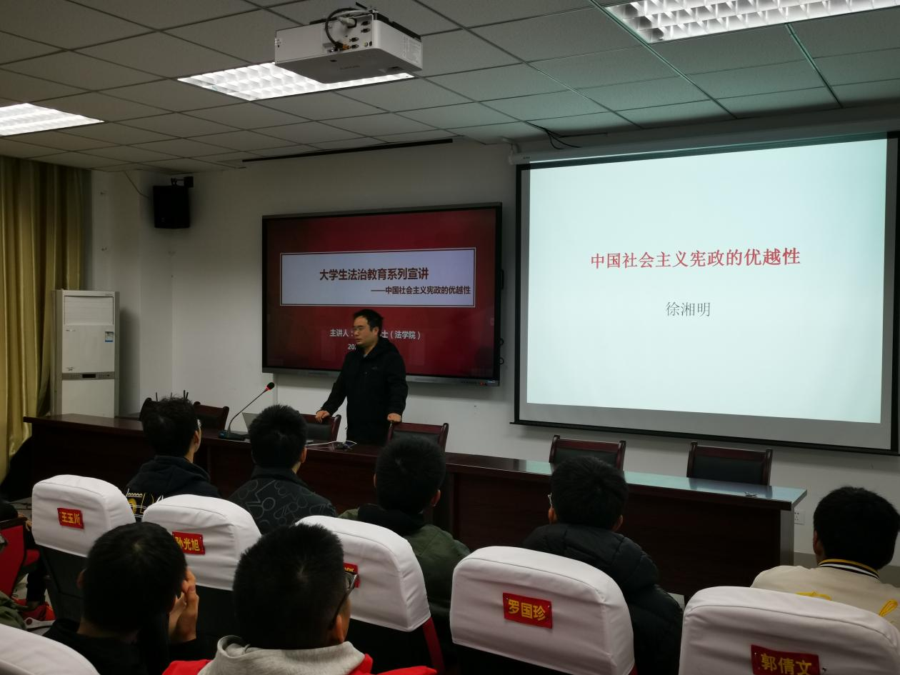 讲座中,徐湘明首先向学生们介绍了宪政的基本内涵。他指出,宪政是以民主政治为基础、保障人权为目的、法治保障为治国方略的政治形态,其基本要素是民主政治、保障人权以及法治,以政治条件、经济条件以及文化条件作为基本条件。接着,他又分别从政治制度、经济制度和文化制度三个方面向我们展现了中国社会主义宪政的优越性,同时还特别提到了中国特有的顶层设计所带来的从中央到地方的强大执行力以及中国政党制度与他国相比所具有的巨大优势。最后,他希冀大家不断增强法治意识,做一个合格的社会主义建设者和接班人。整场讲座气氛活跃,幽默风趣的语言、生动细致的讲解、精彩的案例呈现等赢得了同学们的阵阵掌声。