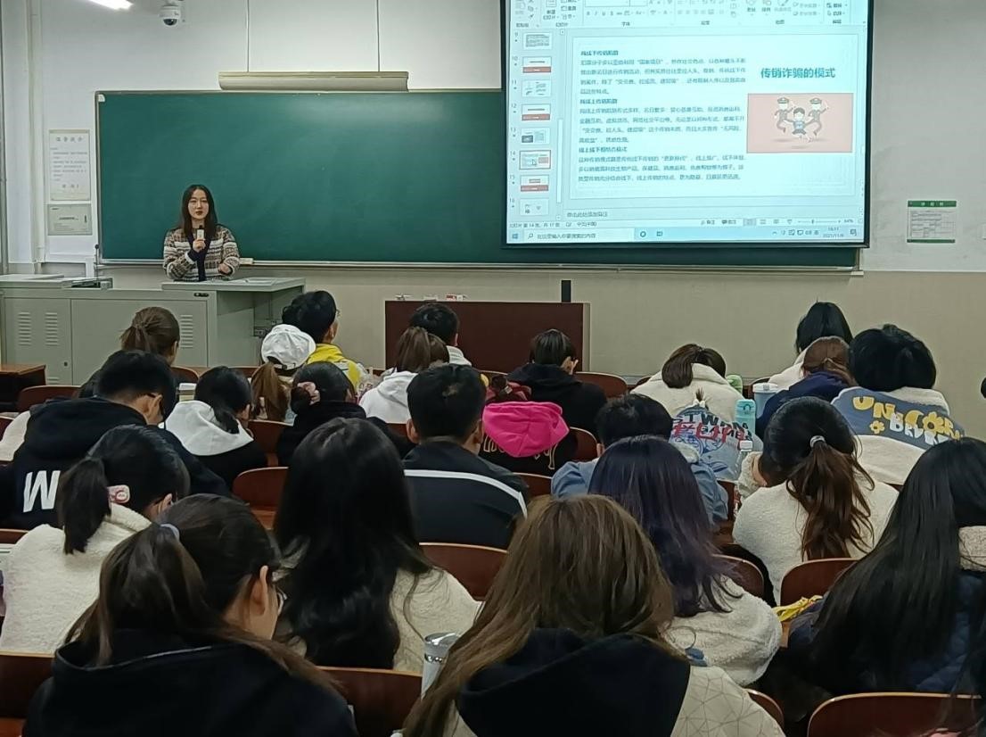 活动开始,徐小雪结合近期高校多发的诈骗案件,向同学们介绍了电信诈骗的常见类型、常用作案手法和作案方式,并通过举例分析发生在高校的案件,让同学们更深刻的感受和了解到了电信诈骗的运作手段和危害。紧接着,很多同学讲述了自己与电信诈骗“零”距离的故事,引起了其他同学的讨论与深思。最后,徐小雪提醒学生在日常的学习生活中,要严加防范电信诈骗,提高识骗防骗能力。同时也要树立正确的消费观,合理消费,坚决抵制不良网贷,切实做到“五不信”“五不露”“五不转”“五不做”“五慎接”。一旦发现自己被电信网络诈骗后,一定要及时向自己的家人、老师、学院求助。